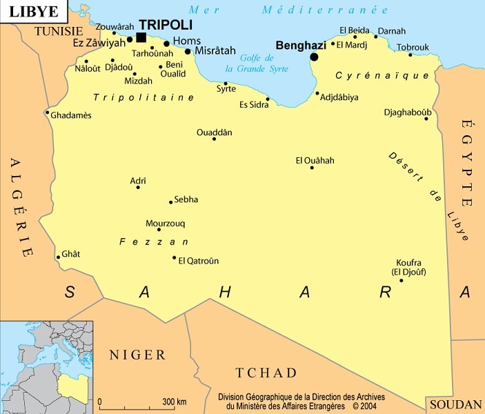 La Libye partage ses frontières avec six pays : l’Égypte à l’est, l’Algérie à l’ouest, la Tunisie au nord-ouest, le Soudan au sud-est, le Tchad et le Niger au sud.
