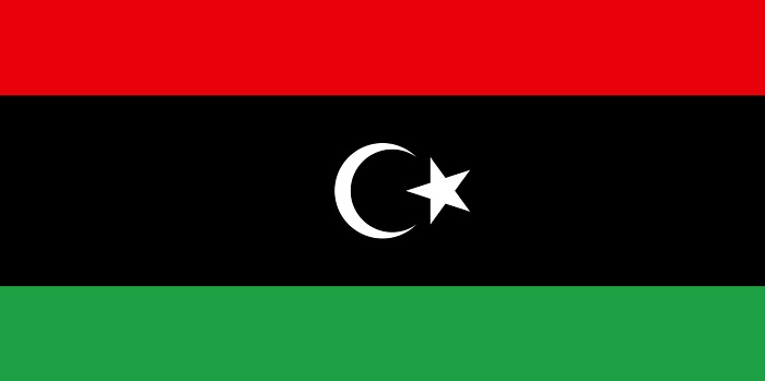 Description du drapeau : Lignes rouge,noire et verte horizontales avec un motif central représentant les armoiries de la Libye (un croissant et une étoile).